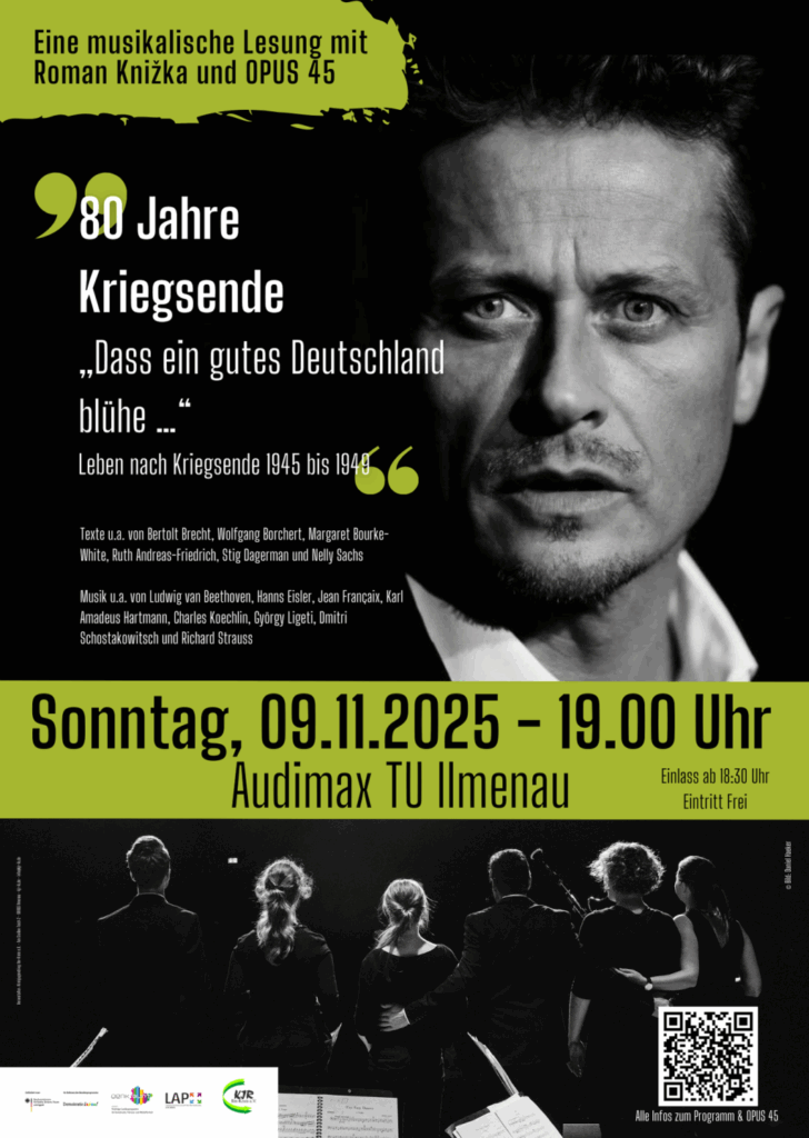 Am Sonntag, 9. November 2025, um 19:00 Uhr (Einlass ab 18:30 Uhr) findet im Audimax der Technischen Universität Ilmenau (Gustav-Kirchhoff-Platz 1, 98693 Ilmenau) eine musikalische Lesung unter dem Titel „Dass ein gutes Deutschland blühe … – Leben nach Kriegsende 1945–1949“ statt. Der Eintritt ist frei.